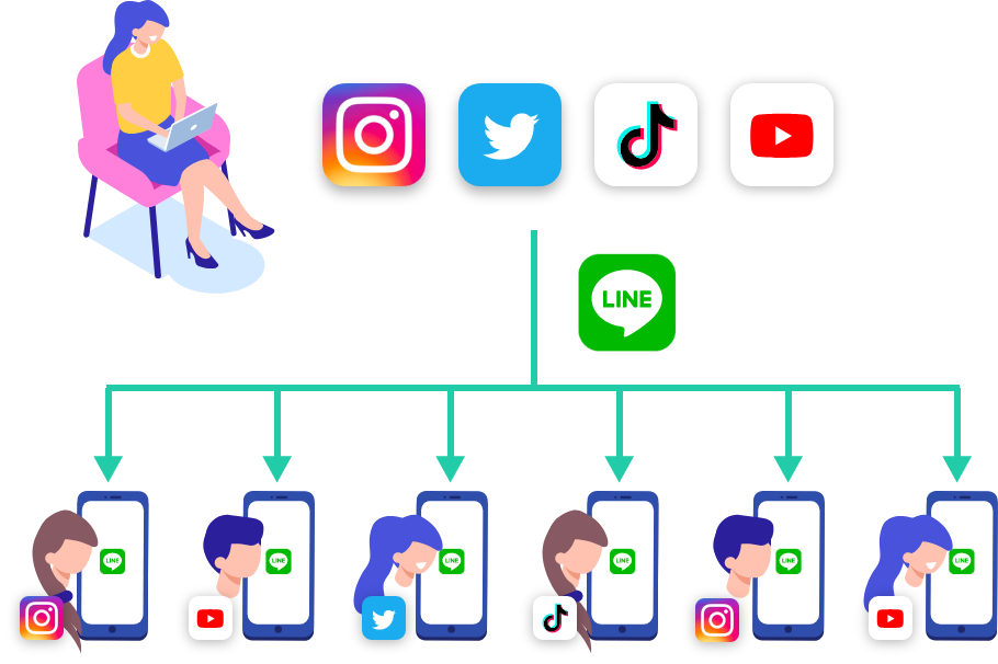 LINE公式アカウントと弊社サービスを連携させて、友達追加URLをSNSのプロフィールに貼るだけ。